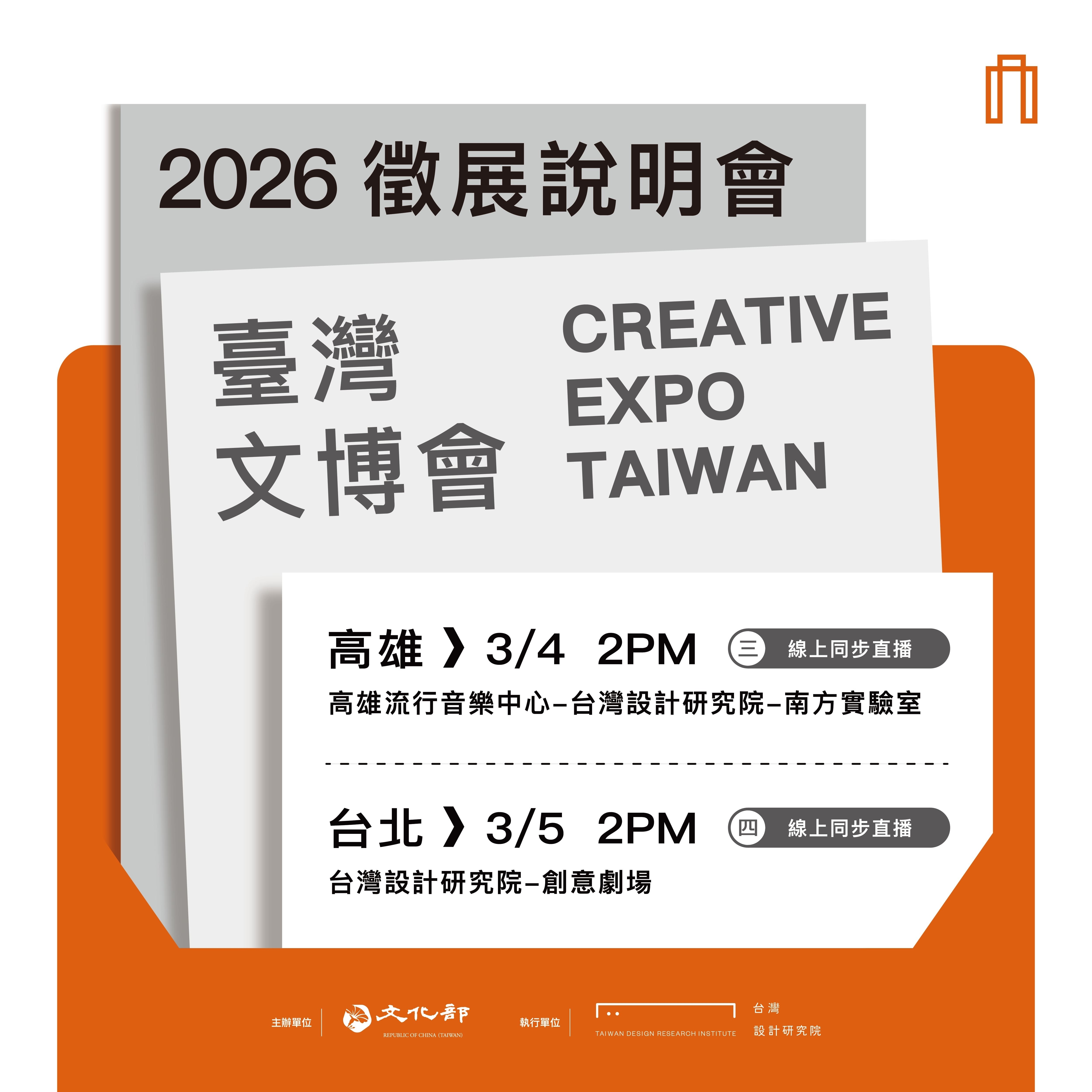 為協助品牌業者與創作者更清楚掌握 2026 臺灣文博會的參展方向與機制,本年度將於 高雄、台北 舉辦徵展說明會,並同步進行線上直播。