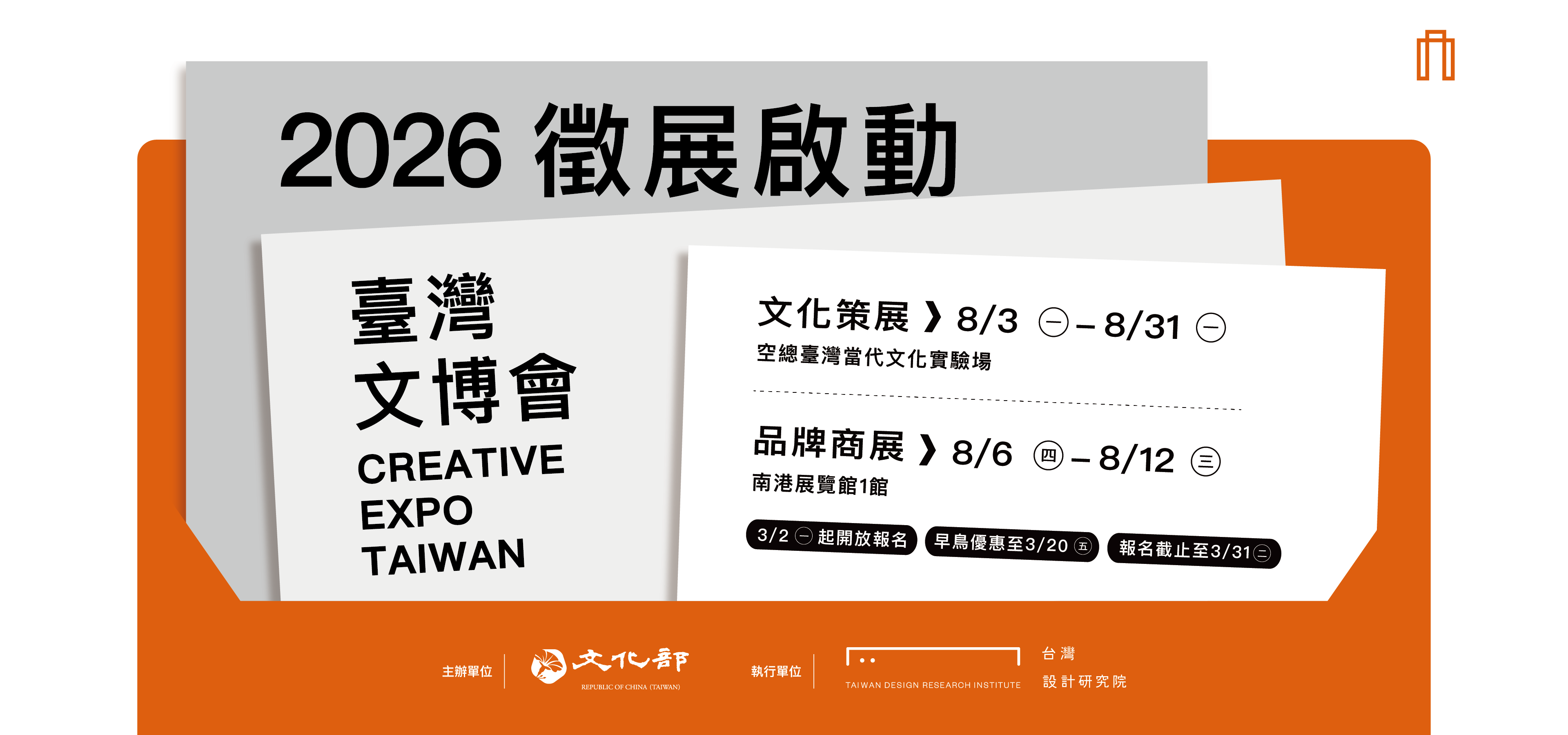 一般參展廠商:即日起至3/31(二)23:59截止 / 早鳥優惠至3/20(五)23:59截止